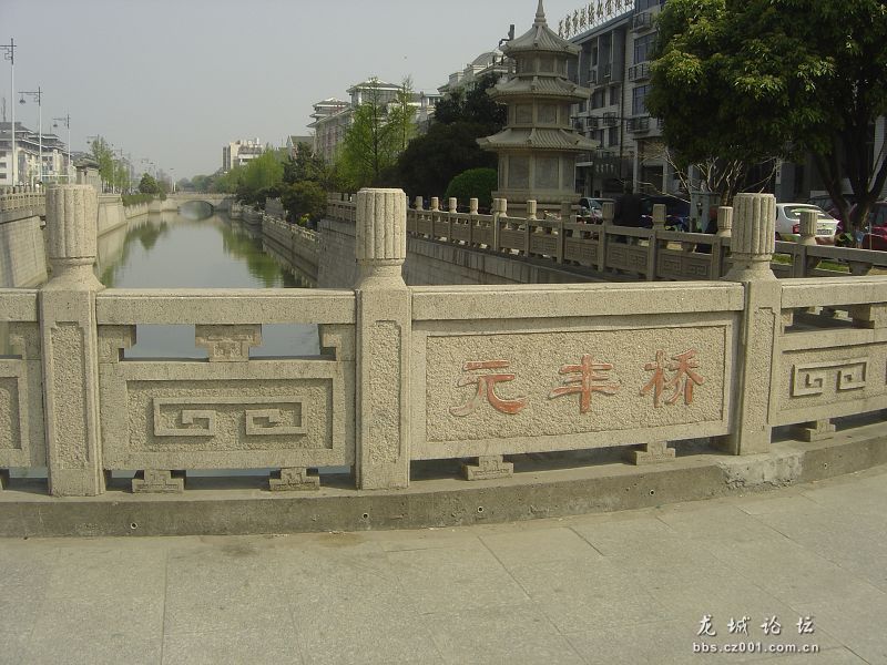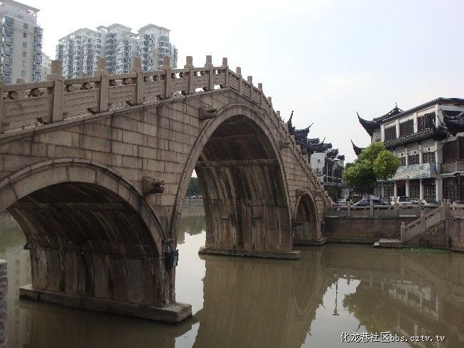 但是请您不要忘记,这里的“新坊桥”单孔石拱桥,他可是常州所有现存石拱桥中的老祖宗,始建于五代十国的梁代大同元年,是常州藉萧洐称帝,史称梁武帝当朝之时。也就是公元535年,至今己有1475年的历史,元朝皇庆年间重建,明朝弘冶十一年重修,1987年被列为常州市文物保护单位。浸长历史的洗涤,风雨的侵触,岁月的磨练,桥己严重剝触,残损,1986年10月常州市人民政府出资重修,次年一月竣工。老桥焕发新姿,修旧如旧,更显古桥庄重美丽,护拦石柱上飘逸朵朵祥云,踏上二十五级石条台阶,向东望去,巍峨壮观的天宁禅寺,仅次于皇宫宫殿般的寺庙建筑层层叠叠,神州第一塔天宁宝塔象一巨大春笋拔地而起,使千年古禅寺增添新辉,具唐塔之气韵,融宋塔之柔美,金刚宝刹塔顶金光耀目。桥下绿地成阴,桥的南北端,中农行大厦,保险大厦,中银大厦。现代化的建筑,古老的石拱桥,交相辉映,诠释着改革开放时代进步的交响曲。1475年的历史,有多少朝多少代常州共出了15个状元,1947个进士,有多少名人学士从这桥上走过,步向成功的颠峰,有多少商贾哲者为常州的繁荣创造辉煌。在改革开放的今天,常州藉的两院院士就达六十多位,为现代化建设立下丰功伟绩。“不识庐山真面目,只缘身在此山中”。