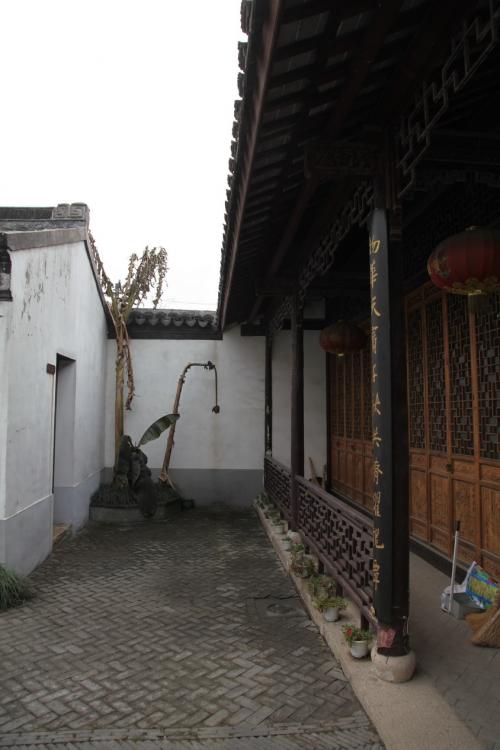 出正堂的轿厅(俗称穿堂),弧形砖木屋顶,圆润的造型、柔和的线条,给人以视觉上的美感。轿厅的建筑形制在武进几近绝迹,在徐氏祠堂幸存可谓弥足珍贵,亦乃宗族子孙有幸,二进与三进之间除轿厅独臻其妙处,有东西回廊,围栏迂回相连,贯通厅堂,轿厅东侧花圃里植有桂树乔木,碧绿一丛,西侧花坛中一株华冠参天、树枝龟裂、虬根隆凸的广玉兰,树龄已有150余年,列为常州古树名木,连接轿厅出口的是与前堂形制相同的坐北朝南向天井的外八字砖雕门楼。古韵犹存。它经历“文革”劫难,砖雕图案和门楼题额已损毁,在重修中只作局部修复,仍保留了部分残迹原貌。进天井抬头望去,砖雕门楼掩映在一片葱茏的广玉兰绿荫下,追今抚昔,给人一种时空交错的沧桑感。