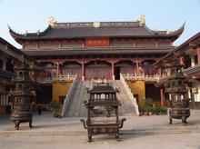 1949年,有低矮破旧庙舍15间,1958年改建成向阳中学。20世纪80年代初学校改办工厂。1998年1月恢复为佛教活动场所。历经7年艰辛,一座占地近16亩、建筑面积8667平方米的寺院重现新貌,蔚为壮观。中轴线第一进是天王殿,高敞气派。殿后是放生池,中有曲桥相通,桥东假山错落有致,池中耸立3.3米高的滴水观音,水珠喷洒而出。第二进,41级石阶之上是大雄宝殿,两层,脊高25.6米。殿东西两壁精绘四大佛山,莲池法会等壁画。背立海岛观音,并塑三圣、西方三圣及罗汉150尊。殿后上端绘有罗汉壁画,书“诸恶莫作,众善奉行”。底层为念佛堂,左、右、后壁供奉11101尊金佛。殿前石阶东侧为观音殿、东岳财神殿,西侧为地藏殿、接引殿,均为三层楼房。另有办公室、斋堂、寮房等一应设施。