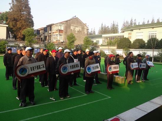 在闭幕式上,来自金坛市人大队、老干部队、公安队等七支老年人门球队,进行了邀请赛。在比赛中,个个精神焕发,充满信心和活力,他们发扬风格,重在参与,经过9场角逐,老干部一队获得冠军、公安队获得亚军、教育队获得季军。