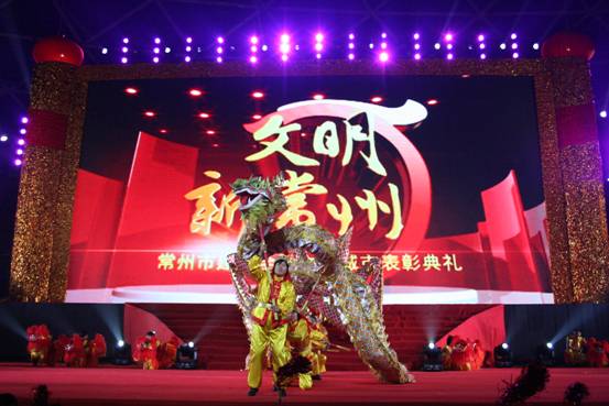 “文明新常州”——常州市建设全国文明城市表彰典礼在奥体中心新城体育馆举行。常州市委书记范燕青、市长姚晓东等市领导参加典礼。新北区春江小学的20位小朋友及春江镇老年女子双龙队队员在热场民俗表演中为大家带来了精彩的打莲响和舞龙表演,向大家送上龙年的欢腾喜庆,将春江的传统民间艺术搬上大舞台,展现在更多人面前。