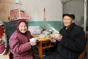 邵家塘沿街的一户房子里,住着92岁的邵良大和91岁的赵巧英,在新农村委,他俩是年龄最大的钻石婚夫妇。推门进屋,当前是一张方桌,赵老太正在折纸元宝,说是逢年过节总得为公婆烧化些。方桌往里,就是老两口的床,自从两年前老太摔了跟头腿脚不便后,老先生请人把床从楼上搬到楼下,“虽说门口噪音大,没有在楼上时睡得安静踏实,但总比让老太婆爬楼梯吃苦头强。”床边的墙头上,是去年12月26日,老两口穿着红堂堂的礼服合拍的一张16寸钻石婚纪念照,“村委组织拍的,一辈子没拍过这么像样的照片”,大照片旁边是2010年11月28日,儿女们为庆祝母亲90大寿拍的全家福,40多人,个个笑容满面。