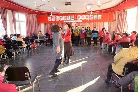 在一片欢声笑语中,队员们用大合唱、男女小合唱、戏曲、舞蹈、等多种表演形式喜迎2012年龙年的到来,活动高潮部分是歌韵队的歌唱老师袁琴华作词作曲的《让我们共享生活》的全体队员大合唱,“歌声里洋溢着对党的热爱,笑语中飘洒着人间的真爱……敬爱的老年朋友,亲爱的兄弟姐妺,让我们共享生活,手挽手、心连心,绘画出“俏夕阳”美好的未来”,激扬欢快的曲调、真情温暖的歌词表达了队员们共同学习、共同歌唱的美好情谊,大家都不由自主地边唱边跳,现场高潮迭起,所有人都沉浸在无比欢乐、真情流露的美好氛围中,尽情释放着对幸福生活的美好祝愿,在欢歌笑语中联欢活动圆满结束。