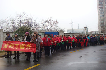 看2011年渐渐远去,龙年到来了,尽管下着毛毛细雨,但是为了庆祝新春的到来,钟楼区金色新城社区党委积极采纳居民建议,组织社区金裳文体协会的腰鼓队、文体队、合唱团、金羽笔友、党员义务巡逻队等各支队伍举着“家和万事兴”的横幅,敲锣打鼓地走在小区的道路上一起为社区居民拜年。